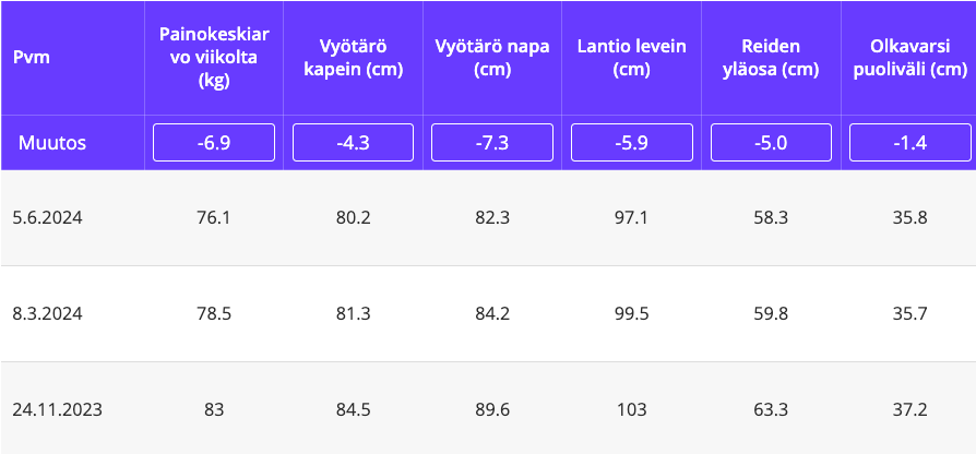 - 6 kuukautta: Rasvaa -8–14 kg. Lihasmassaa +1–2,5 kg. Rasvaprosentti tyypillisesti laskenut 5–10 prosenttiyksikköä. Kehonkoostumus muuttunut näkyvästi. Lähipiirikin alkaa huomaamaan muutoksen ja ihmettelemään mitä olet tehnyt.